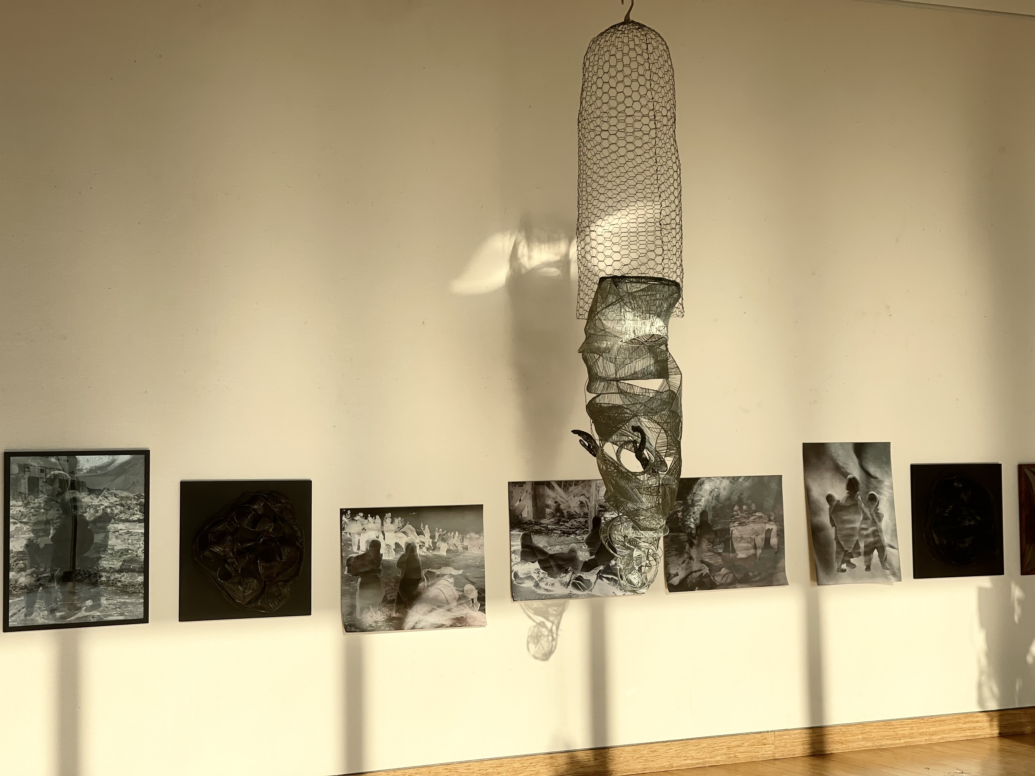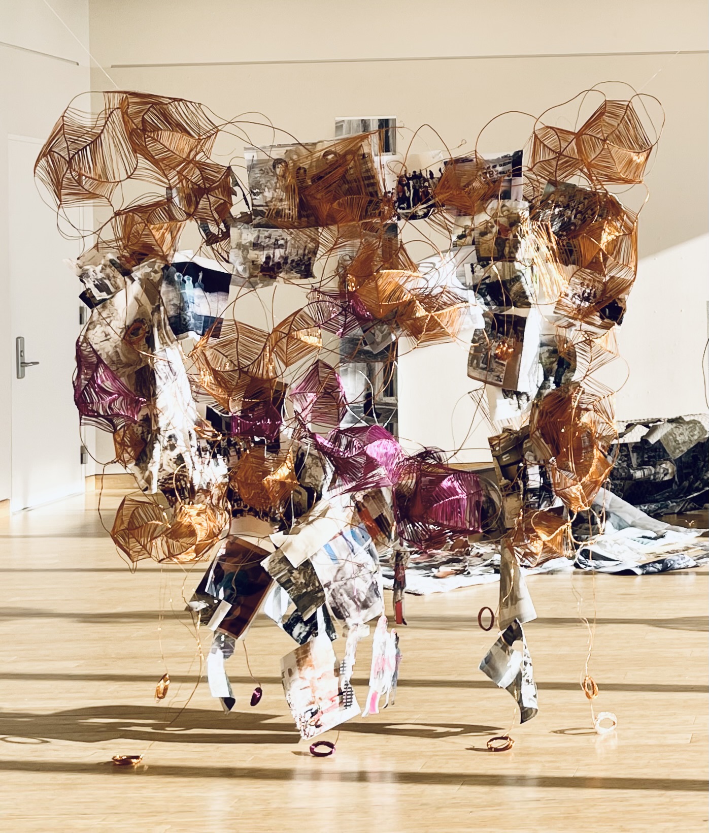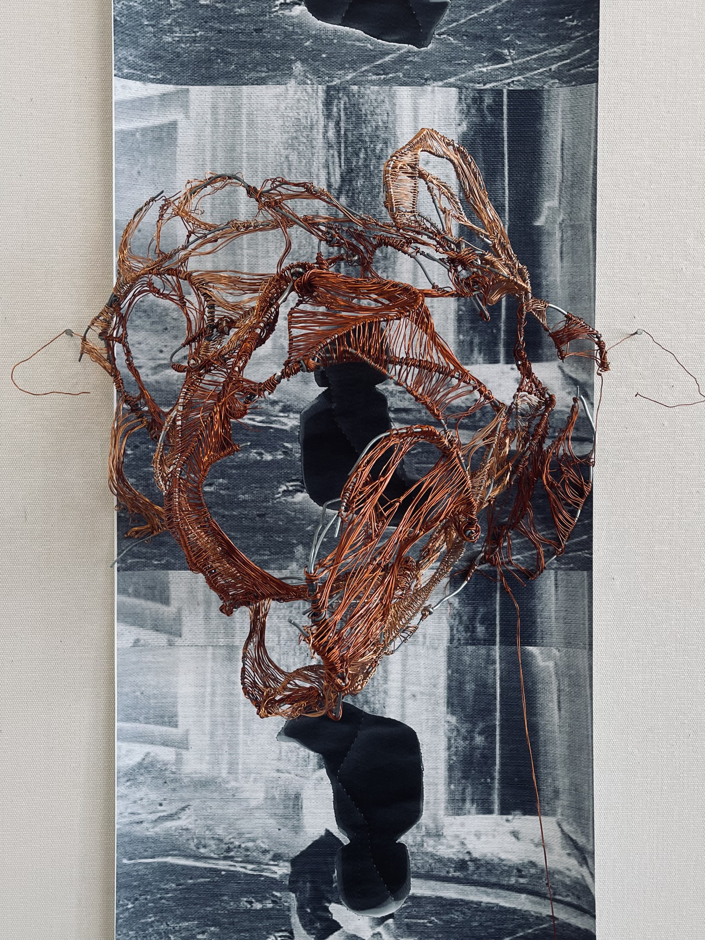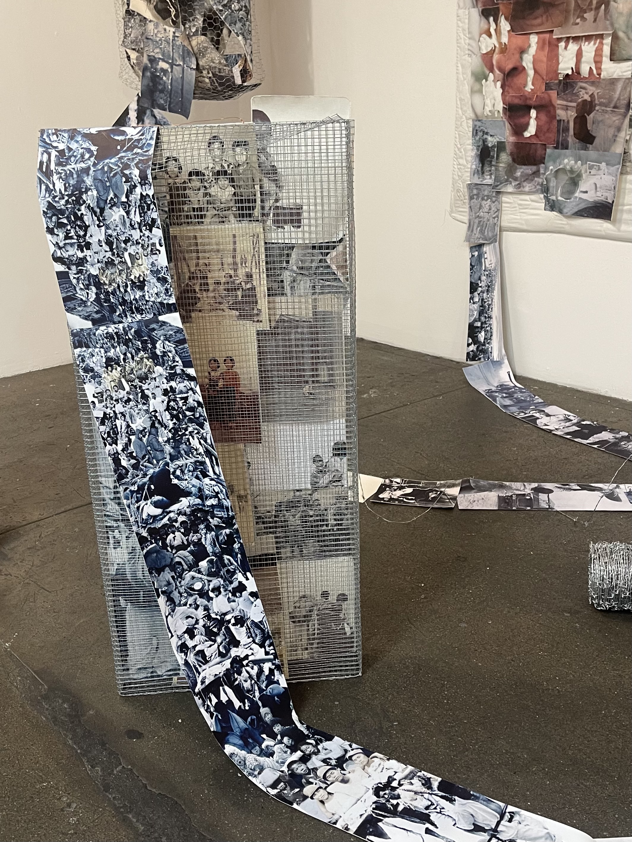 Weaving influences from Handicrafts, Expressionism, and personal and historical narratives accompanied by harmonic glossolalia—speaking in tongues commonly associated with Pentecostal and charismatic Christian traditions—I re-contextualize them with the modernist artistic approaches and narrative deconstructions to contemplate overlooked narratives, while projecting possible identities for the marginalized and providing a commentary on redemptive identity. Using the interior-exterior juxtaposition of my sculptures and collages of imagery intertwined with metal wire as a metaphor of dislocation, nostalgia, assimilation, and desire for belonging, I make my art, situated between chaos and order, emotion and meditation, and isolation and community and weaving together fragments of memory and emotion, I tried to provide a visual language for the universal longing for belonging And contemplating my father’s uprooted trauma from the entire family, I understand his avoidance of modern tools like video chats with me across continents as a bitter reminder of past disconnection. It prompts reflection on ‘genetic trauma’ and the lingering impacts of historical tragedies on individual psyches.