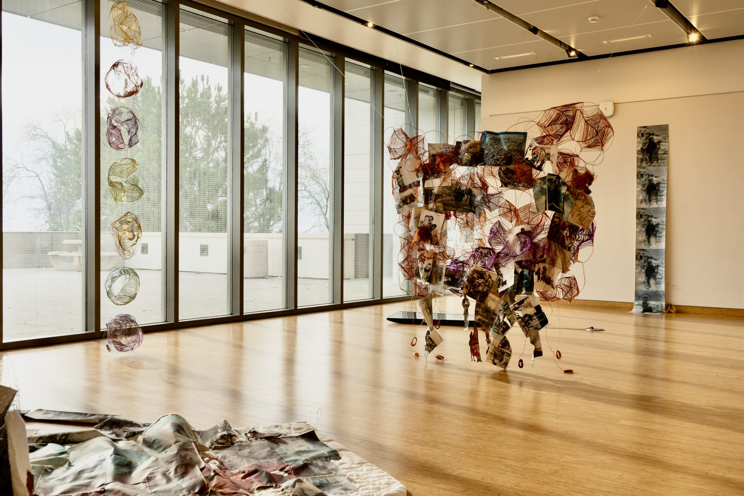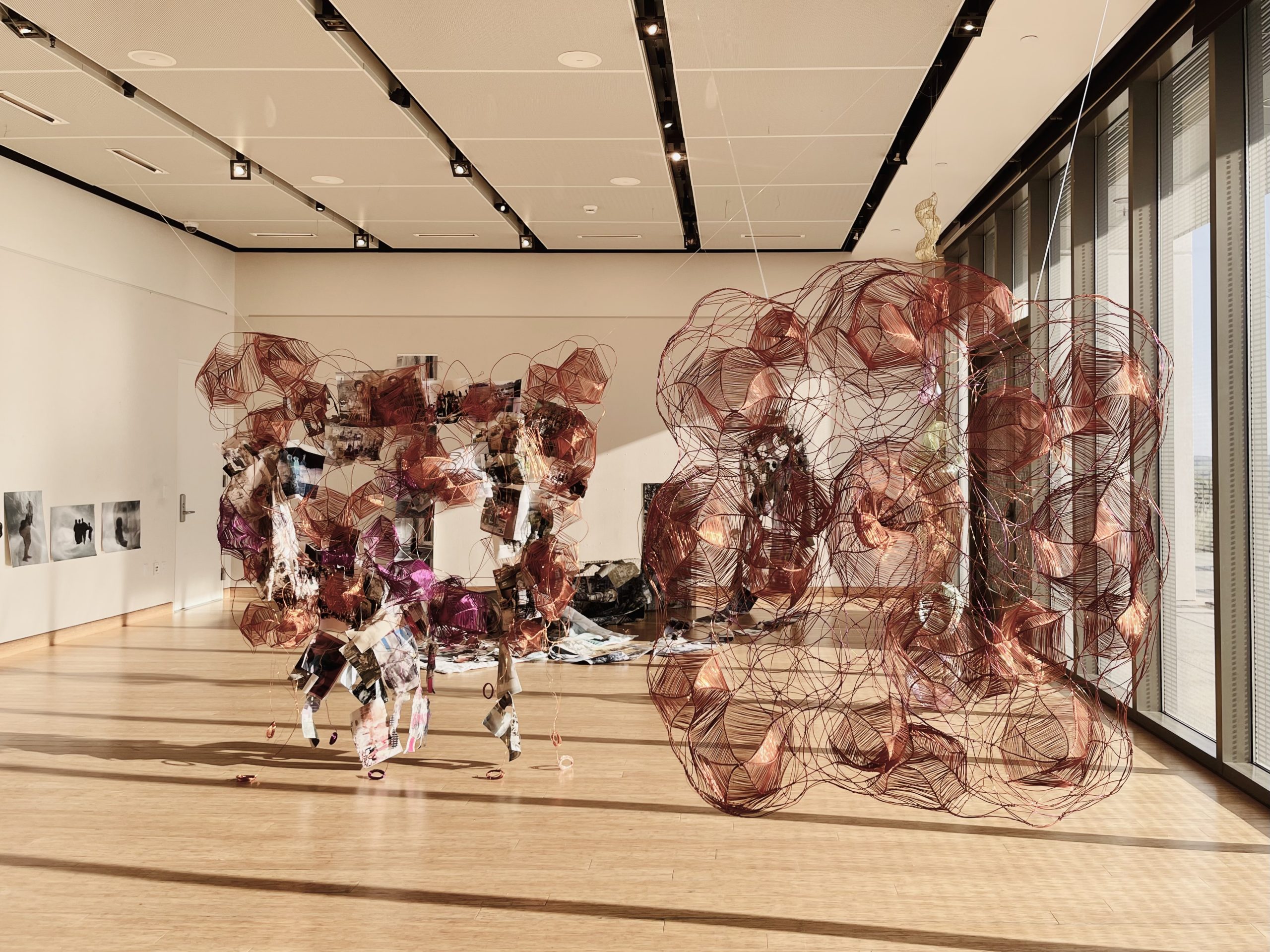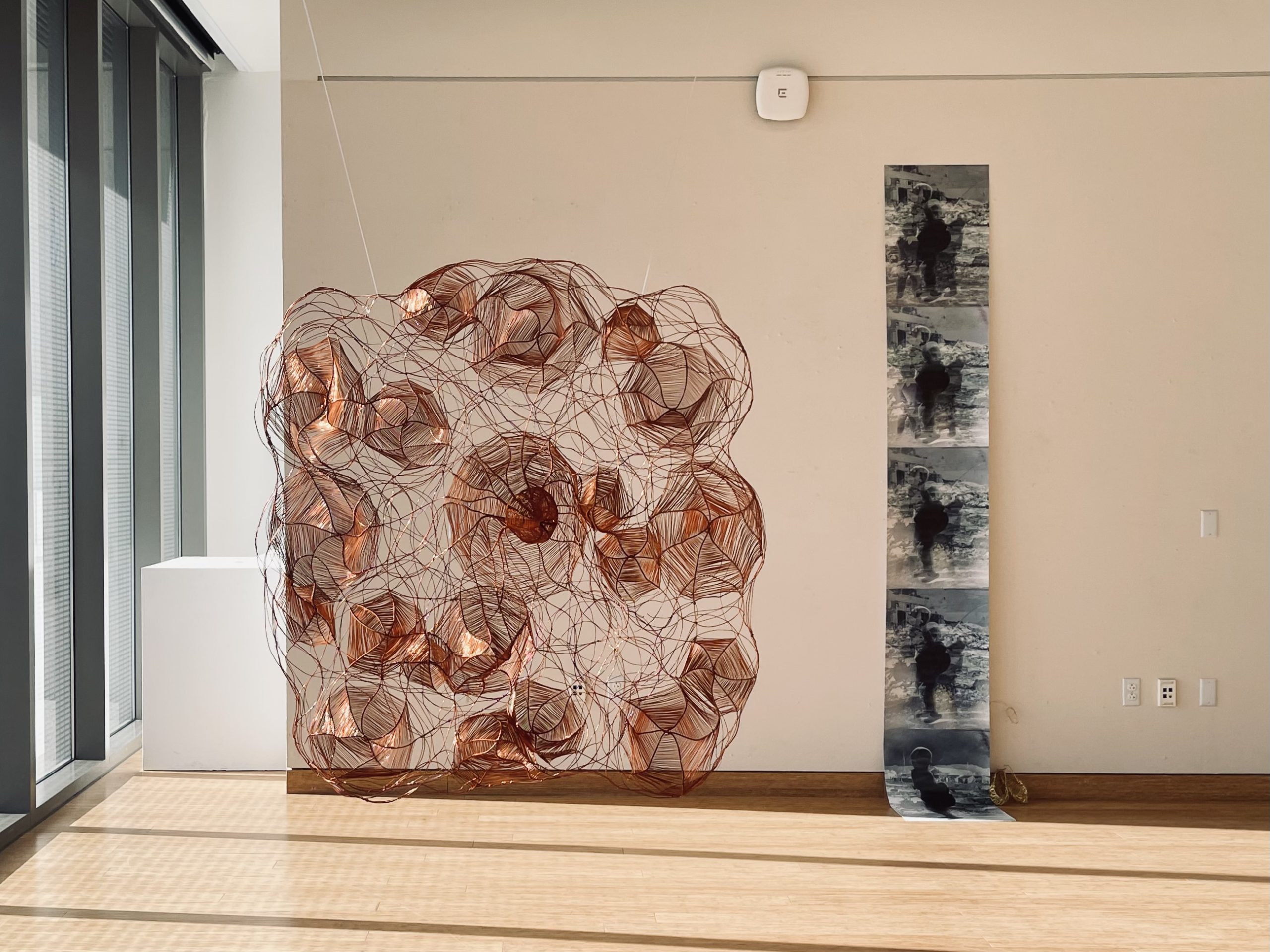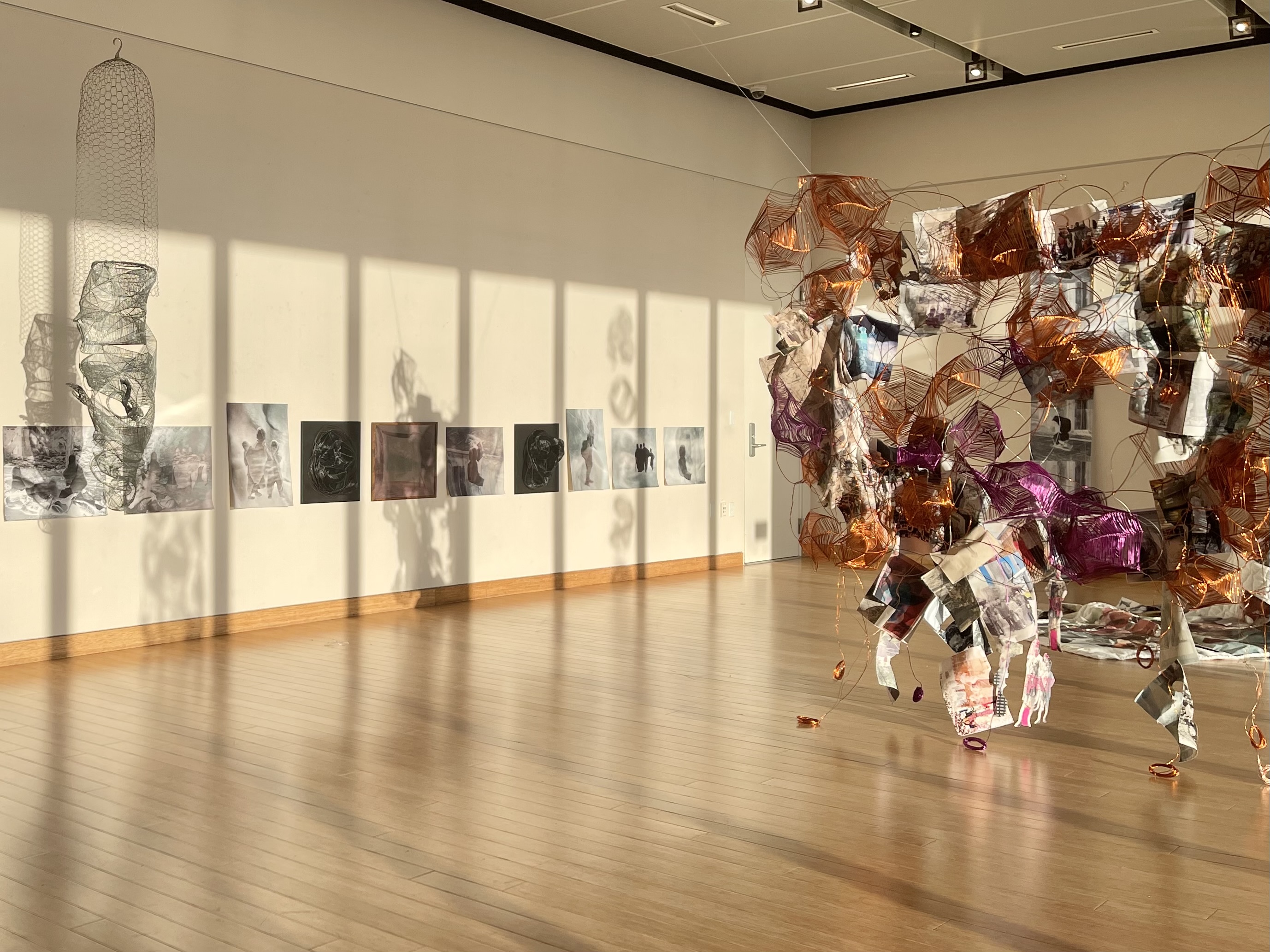 Weaving influences from Handicrafts, Expressionism, and personal and historical narratives accompanied by harmonic glossolalia—speaking in tongues commonly associated with Pentecostal and charismatic Christian traditions—I re-contextualize them with the modernist artistic approaches and narrative deconstructions to contemplate overlooked narratives, while projecting possible identities for the marginalized and providing a commentary on redemptive identity. Using the interior-exterior juxtaposition of my sculptures and collages of imagery intertwined with metal wire as a metaphor of dislocation, nostalgia, assimilation, and desire for belonging, I make my art, situated between chaos and order, emotion and meditation, and isolation and community and weaving together fragments of memory and emotion, I tried to provide a visual language for the universal longing for belonging And contemplating my father’s uprooted trauma from the entire family, I understand his avoidance of modern tools like video chats with me across continents as a bitter reminder of past disconnection. It prompts reflection on ‘genetic trauma’ and the lingering impacts of historical tragedies on individual psyches.